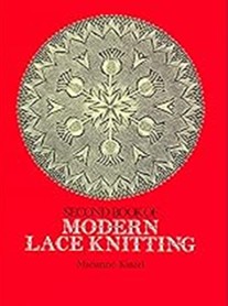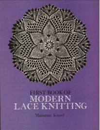 First Book of Modern Lace Knitting by Marianne Kinzel, 1972. Soft cover, 92 pages, 8.25” x 11”. Chapter 1 has basic instructions. Chapter 2. Working instructions for designs knitted on two pins. Chapter 3. Working instructions for designs in round knitting. Chapter 4. Working instructions for square designs. Basic lace stitches include, daisy, diamond, cross stitch, peacock’s eye, honeycomb, ladybird, and ladder. General rules and tips on tension are included as well as picking up stitches, joining threads, etc. Small or larger projects are possible. The book is well designed and has many photos of lace in progress, and finished designs such as the one on the cover. Price: $15.