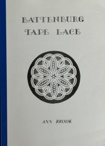 Battenburg Tape Lace by Ann Brook, 1989. Duotang format, 24 pages, single sided, 8.25” x 11.75”. Black and white photos. The author begins with an intro and materials needed. Fillings include herringbone, wheel stitch, wheel filling, whipped diagonal bars, knotted bars, and the sunray design. Working instructions are illustrated. Designs are shown with 8mm tape, or 5 mm tape can be used. Threads are coton à broder 25 or DMC perlé 12 (or similar). Small designs: A triangle design, a butterfly, a fan, a scallop border, and a “three bears” design. Larger designs: a child’s collar, a round window design, a table mat edging, and a round of six butterflies, Price: $10.