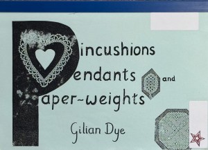 Bobbin Lacemaking by Jinan Jabagi, Textile Fashion Designer and Lace Maker. Duotang format, 33 pages. The beginning pages have a list of materials, how to wind a bobbin, illustrations and info on cloth stitch, half stitch, hanging bobbins from a pin, a sample pricking for practice, patterns and photos of sampler stitches, footsides, spiders, a wide braid pattern, two bookmarks, fan patterns (straight and on a curve), a spider bookmark, a fan sampler bookmark, two corner designs with a “spider & fan” pattern, and a “scallop and diamond” pattern. The author has suggested threads, plus bobbin counts, and a black & white photo of the finished projects. Price: $10.