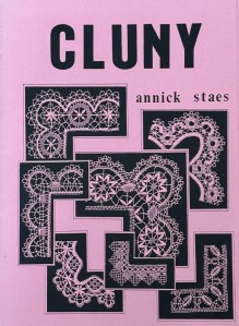 Cluny by Annick Staes. The pattern folder has seven patterns each on separate cardstock, and are shown on the front cover. Info is in English, Dutch, French, and German. Designs have a list of bobbins, threads, and enlarged stitch diagrams, plus symbols of techniques where needed, and a black and white photo of the finished lace. The patterns have names: Arielle, Constance, Florentina, Kathleen, Marie, Rose Anne, and Tulipa. Price: $20.