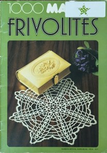 1000 Mailles Frivolites. Teresa Masuet Curto, rédactrice en chef, Les Editions de Saxe, Lyon, France. Soft cover, 48 pages, French text. The book has basic tatting instructions in the first five pages, followed by ten chapters for borders, motifs, and includes some larger tatting projects (napperons). Enlarged images show the counts for all stitches and picots plus black and white photos of finished projects. Price: $10.