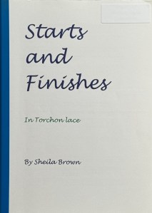 Starts and Finishes in Torchon Lace by Sheila Brown, 1990. Self published, duotang, 29 pages, 8.25” x 11.75”, black and white photos. The author begins with an introduction of basic stitches, foot pin, grounds, fans, spiders, and the Princess Braid finishing for bookmarks. Starts at a horizontal line, at a point (three types of starts), circles and squares worked in a quadrant, edgings and insertions with gimp, circular mats with straight edges and Spanish fan edges. The author includes photos of works in progress and gives “starts and finishes” for all. Price: $10.